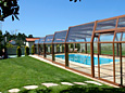 L’abri reste en permanence au dessus de la piscine tel une veranda. Très souvent adossé ou accolé (mural) à la maison l’abri fixe se rapproche alors beaucoup d’une veranda sur une piscine intérieure, Ce type d’abri fixe comporte généralement des parois vitrées relevables ou des vantaux coulissants afin d’ouvrir largement l’espace piscine sur l’extérieur. Enfin si la majeure partie de la toiture de l’abri reste fixe, l’on peut en général en ouvrir une ou plusieurs zones pour aérer et profiter du soleil.